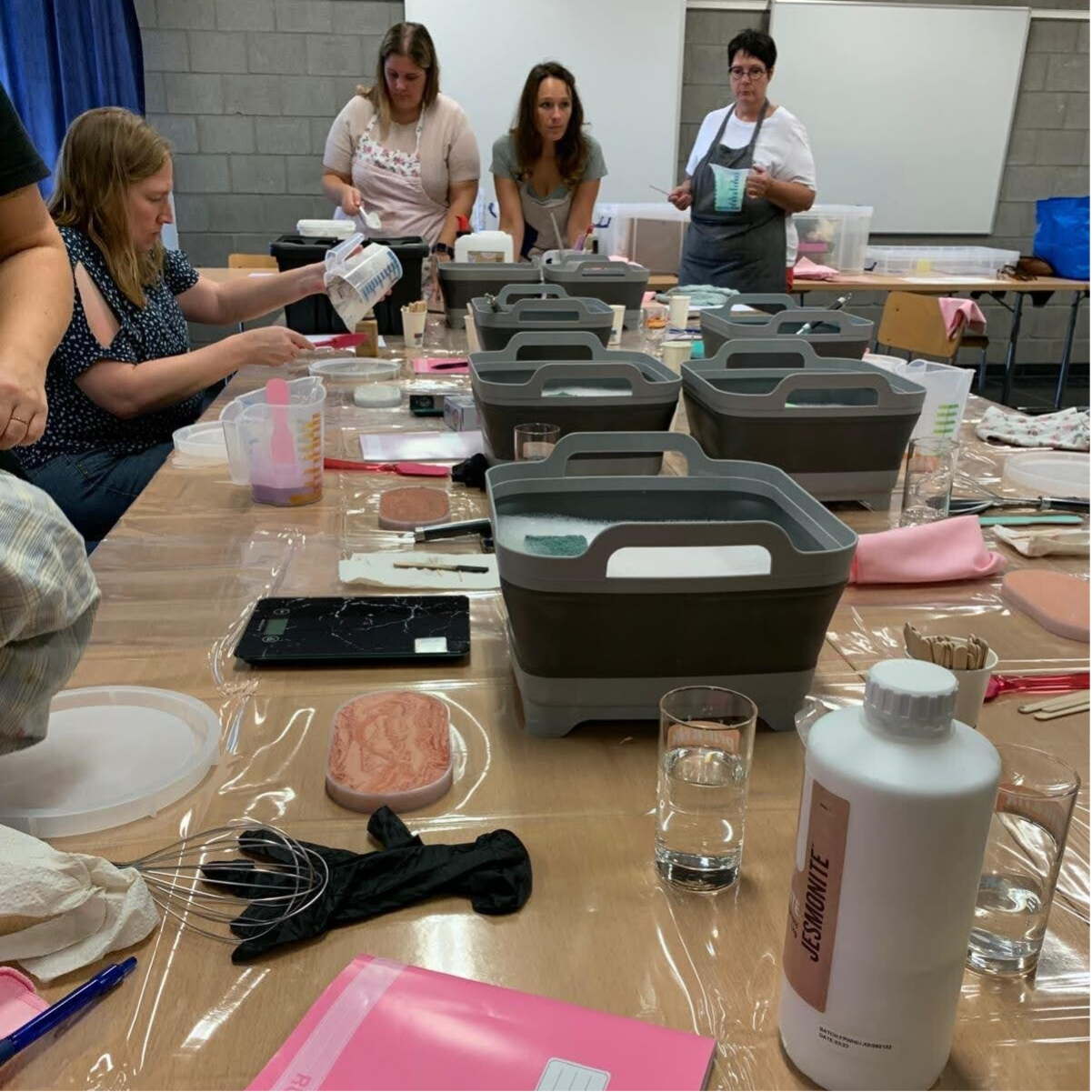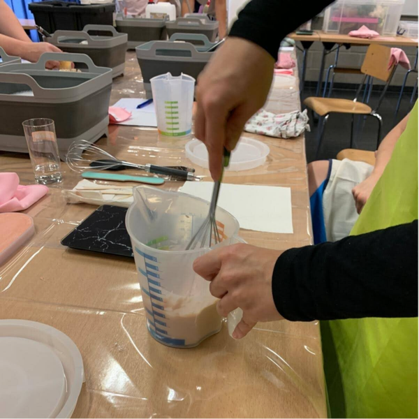 Alle materialen en benodigdheden voor de workshop (Jesmonite, pigmenten, mallen, etc.) zijn door ons voorzien